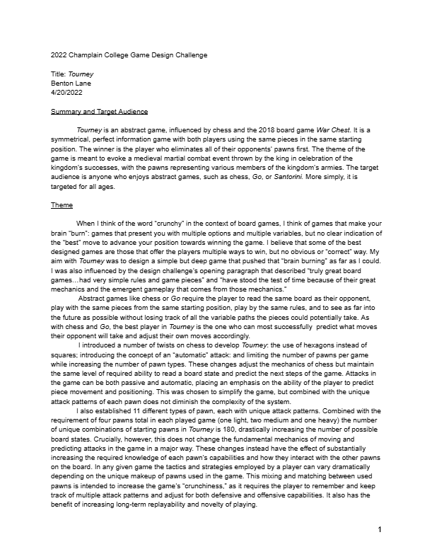 To this day, Tourney remains one of my proudest game designs. It does a lot with very little, and helped set me on the path to working on making games. I had to teach myself how to use Illustrator, how to playtest with real people and iterate on their feedback, and the joy of watching creating something people wanted to engage with again and again because it is fun.