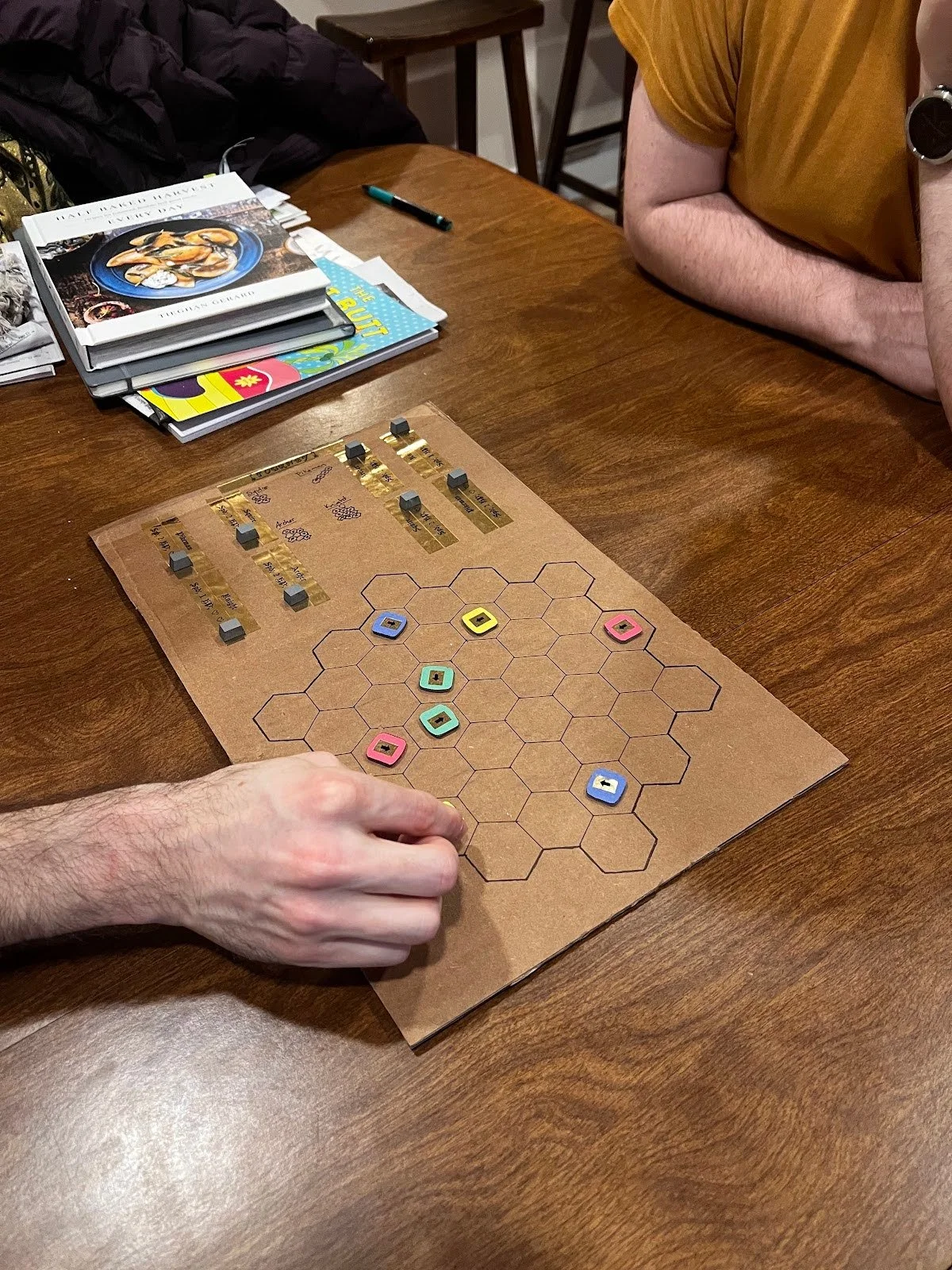 The third version of Tourney’s board, now with custom pawn pieces and printed rulebook
